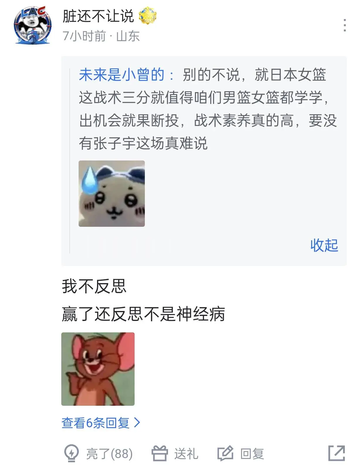 在2场大胜波黑113分后,中国女篮终于迎来了一个强有劲的对手,曾经多次获得亚洲杯冠军的日本女篮。这场比赛,双方打的非常激烈,尽管我们拥有内线优势,但日本队在外线狂投三分,而且命中率还很高,导致双方分差始终拉不开,最终我们也只多赢9分(这还不是日本女篮全主力)。对此,有球迷表示日本队的战术三分就值得咱们男篮女篮都学学,出机会就果断投。而反对者则认为:我不反思,赢了还反思不是神经病。